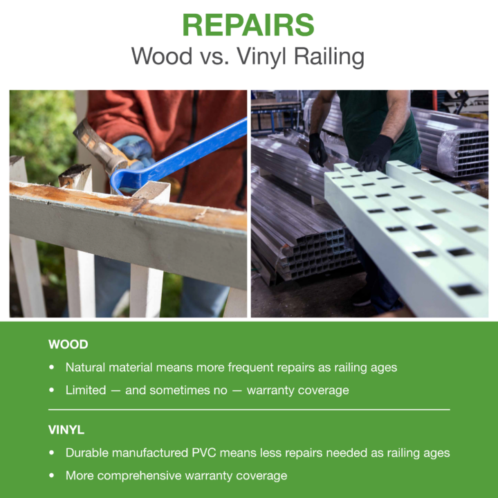Perhaps the biggest difference between wood and vinyl railing is the amount of maintenance each requires. Wood railing requires considerably more upkeep, not only to keep the railing looking good but to increase the longevity of the product. Wood railing requires regular painting, staining or sealing to keep its appearance and to protect the wood from rotting, warping and insects. This upkeep means a considerable investment of time and money.