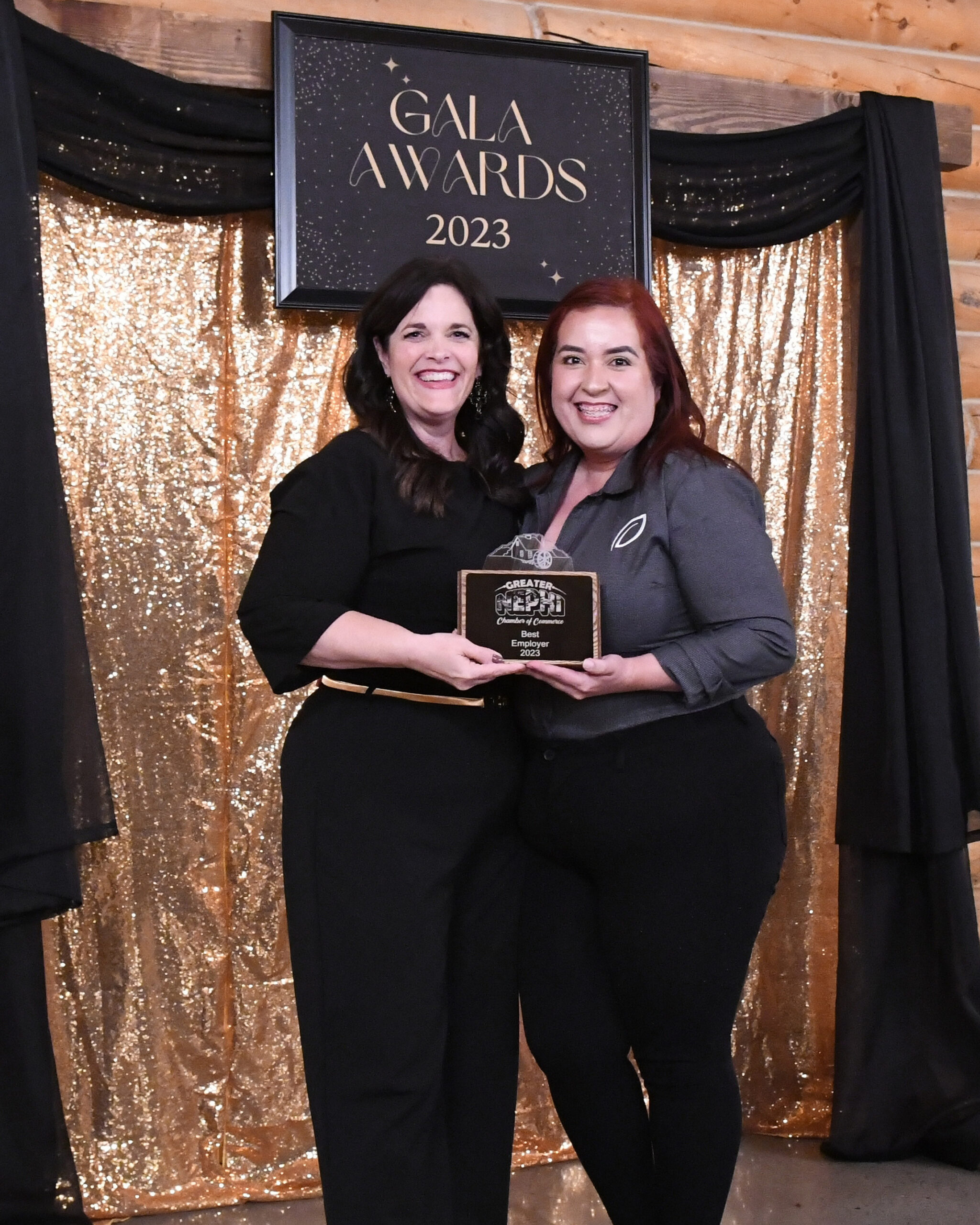 Pictured (l to r): Abby Ivory, Executive Director, Greater Nephi Chamber of Commerce, presents the Chamber’s 2023 Best Employer Award to Carolina Moore, Human Resources Manager, Barrette Outdoor Living